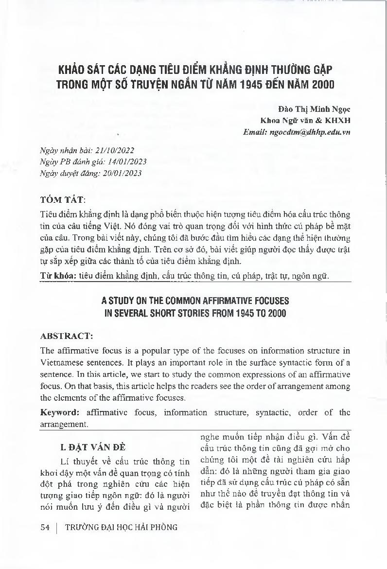 Khảo sát các dạng tiêu điểm khẳng định thường gặp trong một số truyện ngắn từ năm 1945 đến năm 2000 = A Study On The Common Affirmative Focuses In Several Short Stories From 1945 To 2000