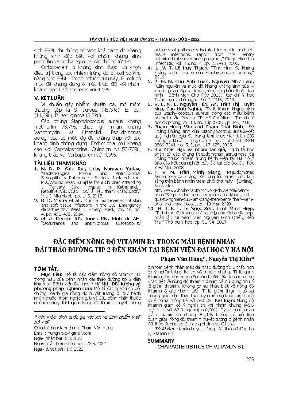 Đặc điểm nồng độ vitamin B1 trong máu bệnh nhân đái tháo đường tuýp 2 đến khám tại Bệnh viện Đại học Y Hà Nội = Characteristics of vitamin B1 concentration in the blood of type 2 diabetes patients at Hanoi medical university hospital