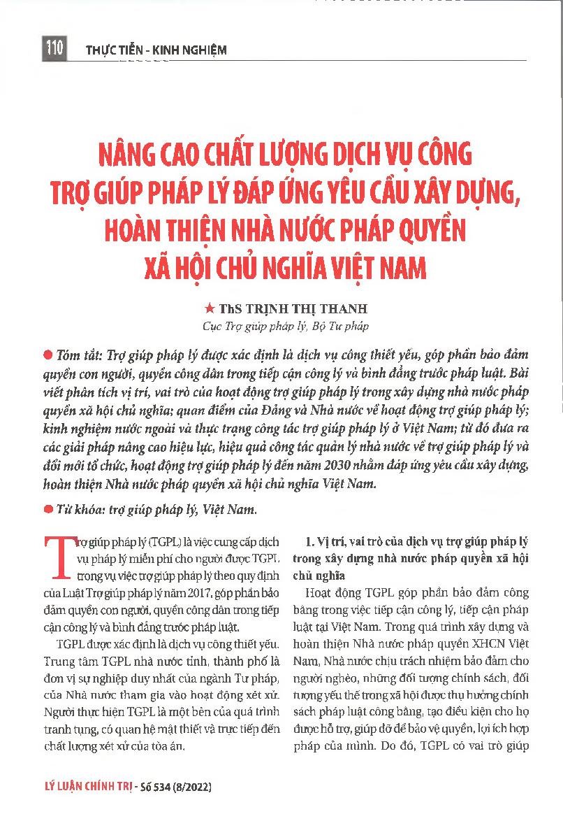 Nâng cao chất lượng dịch vụ công trợ giúp pháp lý đáp ứng yêu cầu xây dựng, hoàn thiện Nhà nước pháp quyền xã hội chủ nghĩa Việt Nam