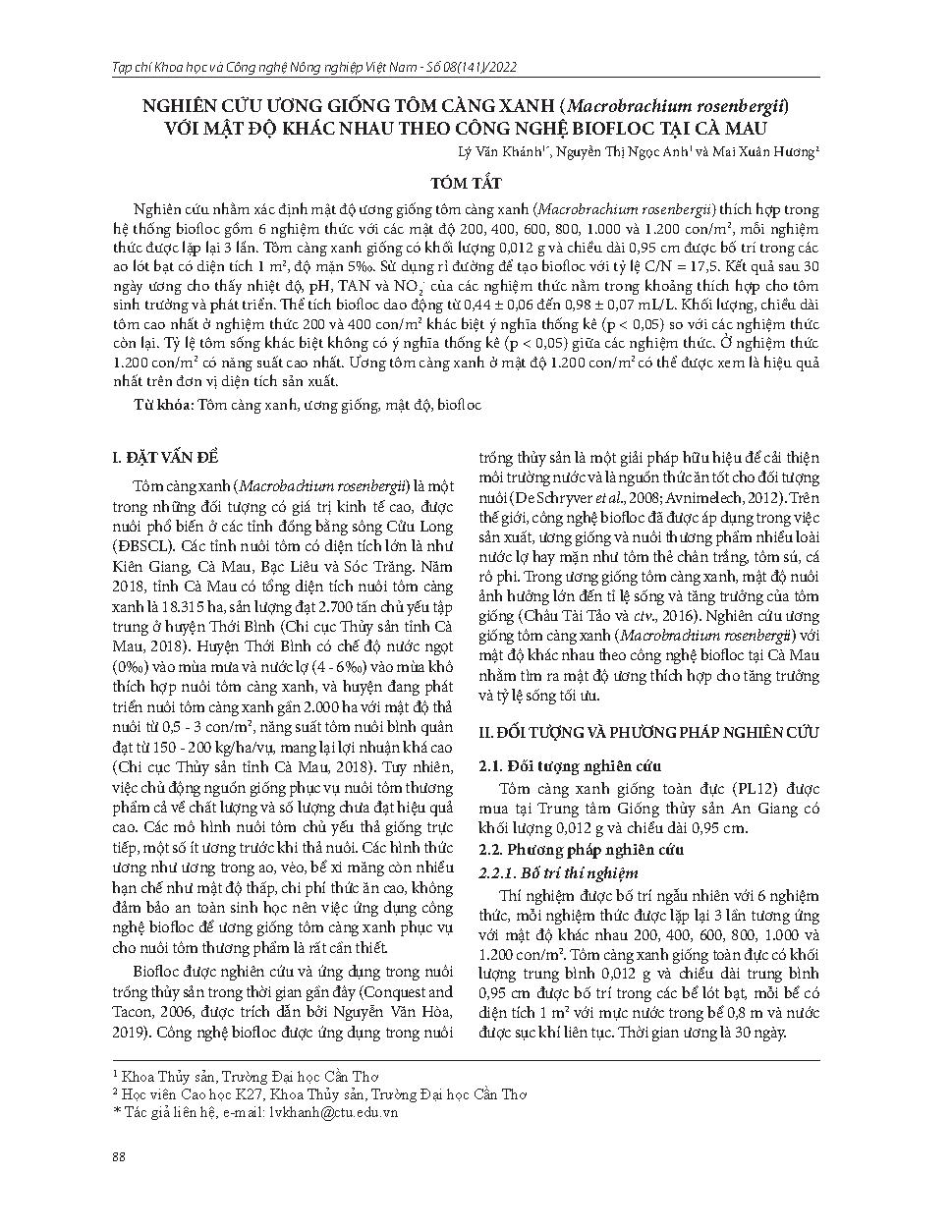 Nghiên cứu ương giống tôm càng xanh (Macrobrachium rosenbergii) với mật độ khác nhau theo công nghệ biofloc tại Cà Mau = Study on nursing giant freshwater prawn (Macrobrachium rosenbergii) postlarvae with different stocking densities applying biofloc tech