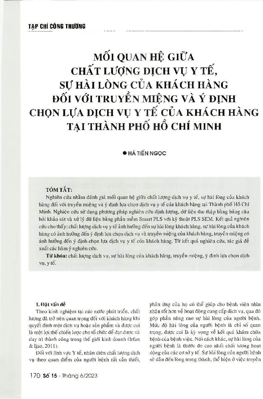 Mối quan hệ giữa chất lượng dịch vụ y tế, sự hài lòng của khách hàng đổi với truyền miệng và ý định chọn lựa dịch vụ y tế của khách hàng tại Thành phố Hồ Chí Minh
