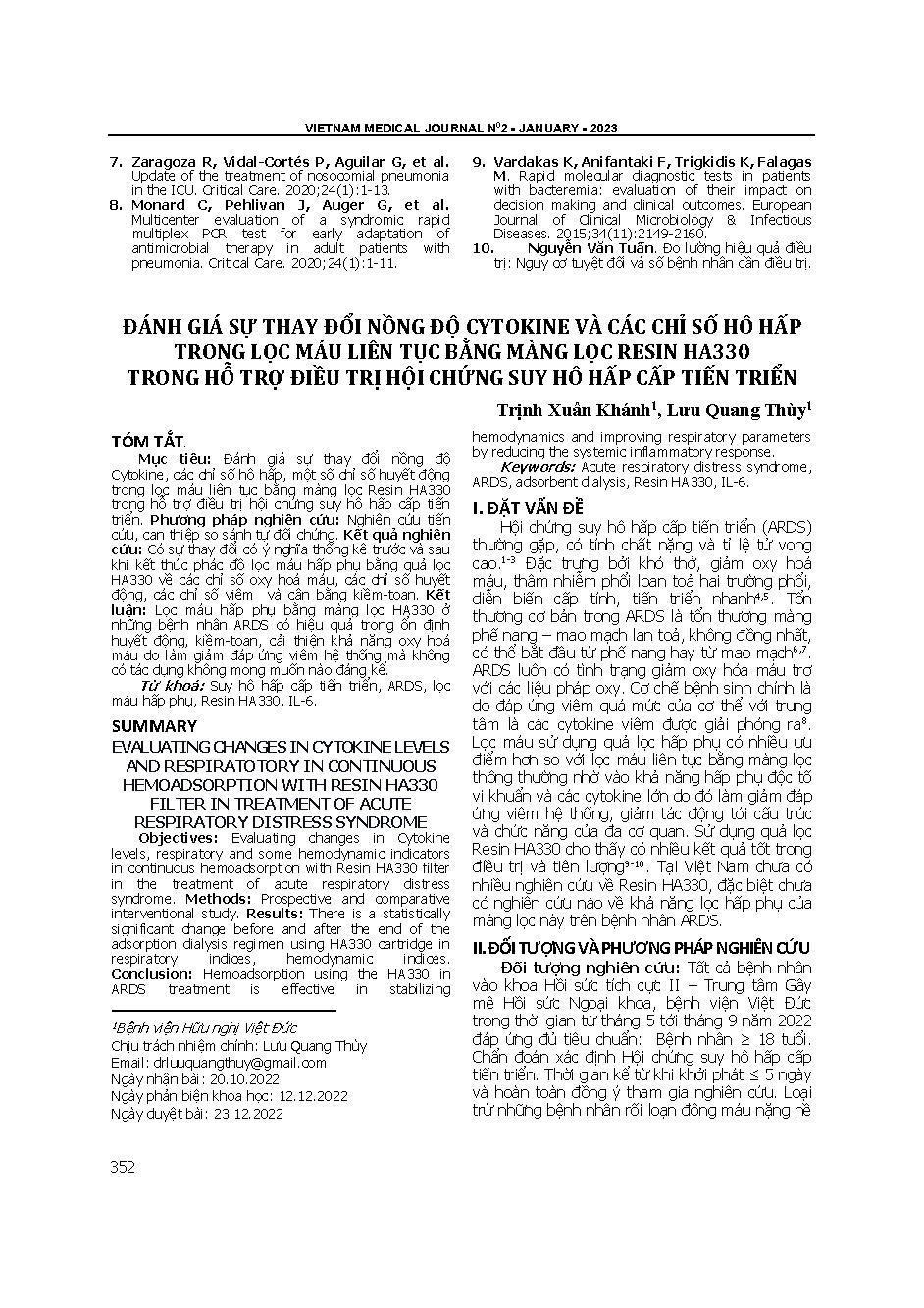 Đánh giá sự thay đổi nồng độ cytokine và các chỉ số hô hấp trong lọc máu liên tục bằng màng lọc Resin HA330 trong hỗ trợ điều trị hội chứng suy hô hấp cấp tiến triển = Evaluating changes in cytokine levels and respiratotory in continuous hemadsorption wit