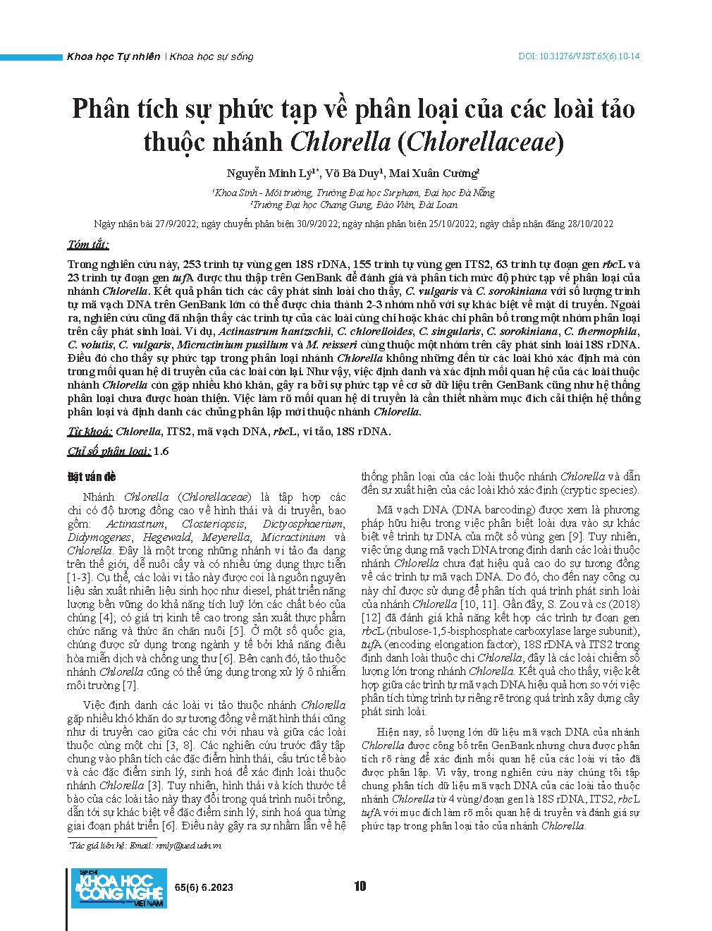 Phân tích sự phức tạp về phân loại của các loài tảo thuộc nhánh Chlorella (Chlorellaceae) = Taxonomic complexity analysis of the Chlorella clade (Chlorellaceae)