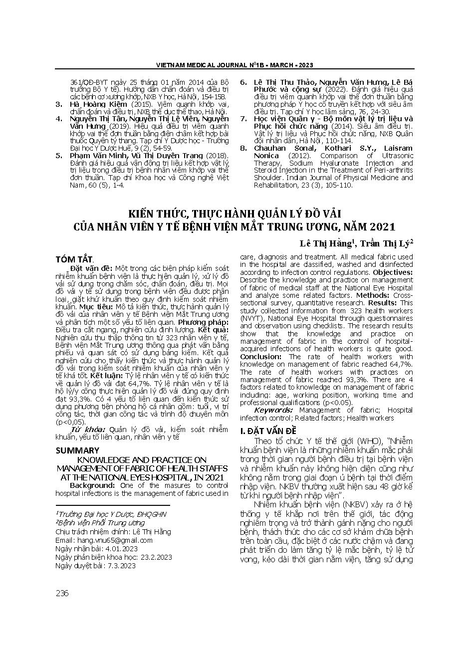 Kiến thức, thực hành quản lý đồ vải của nhân viên y tế Bệnh viện Mắt Trung ương, năm 2021 = Knowledge and practice on management of fabric of health staffs at the National eyes hospital, in 2021