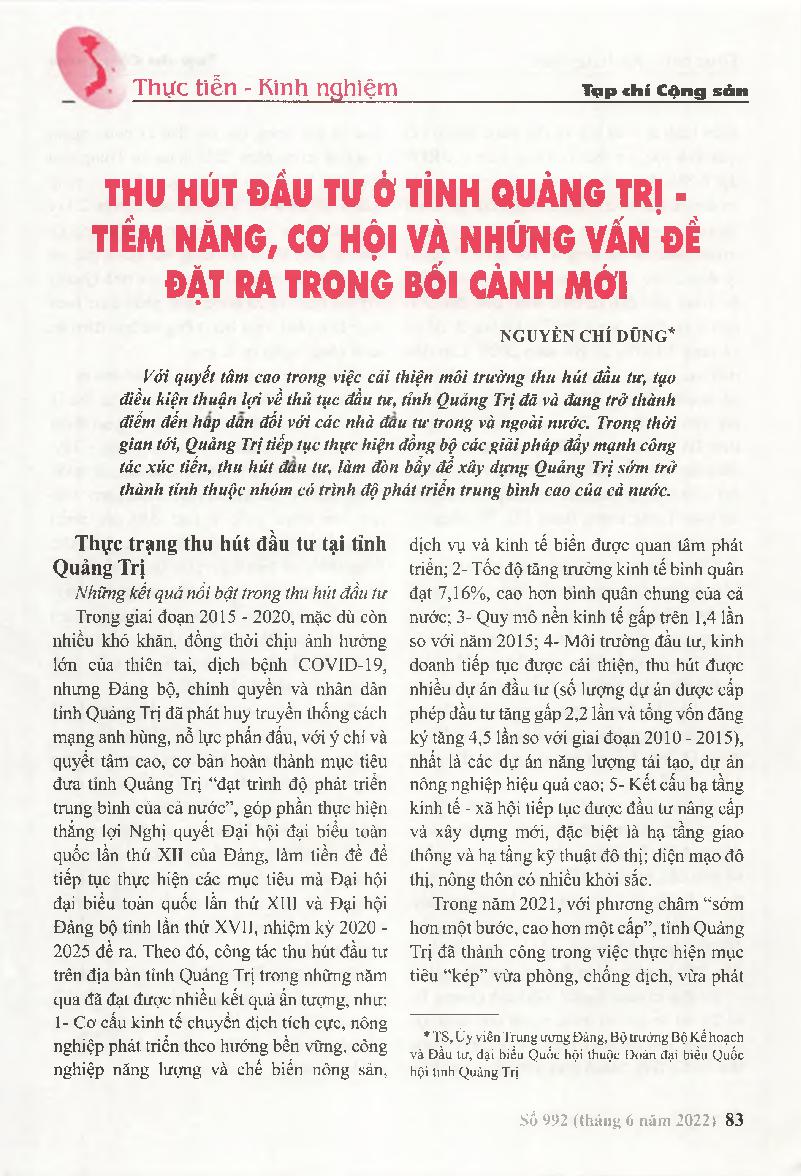 Thu hút đầu tư ở tỉnh Quảng Trị - Tiềm năng, cơ hội và những vấn đề đặt ra trong bối cảnh mới = Attracting investment in Quang Tri province - Potentials, opportunities and problems in the new context