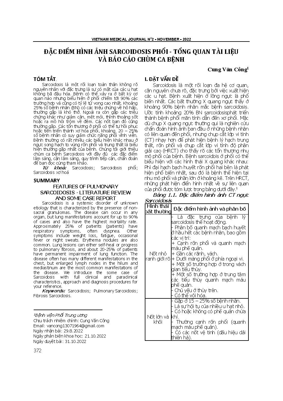 Đặc điểm hình ảnh sarcoidosis phổi - Tổng quan tài liệu và báo cáo chùm ca bệnh = Features of pulmonary sarcoidosis - Literature review and some case report