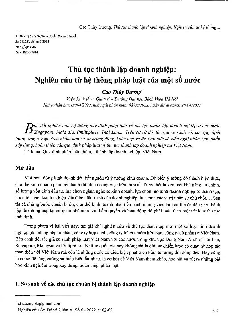 Thủ tục thành lập doanh nghiệp: Nghiên cứu từ hệ thống pháp luật của một số nước = Procedures for setting up a business: A study from the legal system of some countries