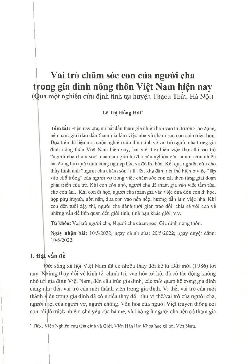 Vai trò chăm sóc con của người cha trong gia đình nông thôn Việt Nam hiện nay (Qua một nghiên cứu định tính tại huyện Thạch Thất, Hà Nội) = The Father&; 39;s Roles in Taking Care of Children in Current Rural Family in Vietnam (a Qualitative Analysis in Tha