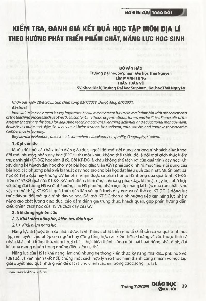 Kiềm tra, đánh giá kết quả học tập môn Địa lí theo hướng phát triển phẩm chất, năng lực học sinh = Assessment of learning results of Geography in the direction of developing students'quality and capacity.