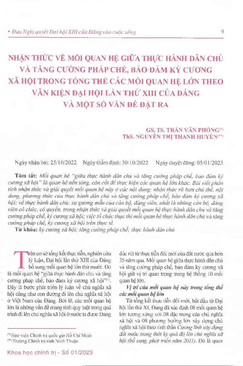 Nhận thức về mối quan hệ giữa thực hành dân chủ và tăng cường pháp chế, bảo đảm kỷ cương xã hội trong tổng thể các môi quan hệ lớn theo Văn kiện Đại hội lần thứ XIII của Đảng và một số vấn đề đặt ra = Awareness of the relationship between practicing democ