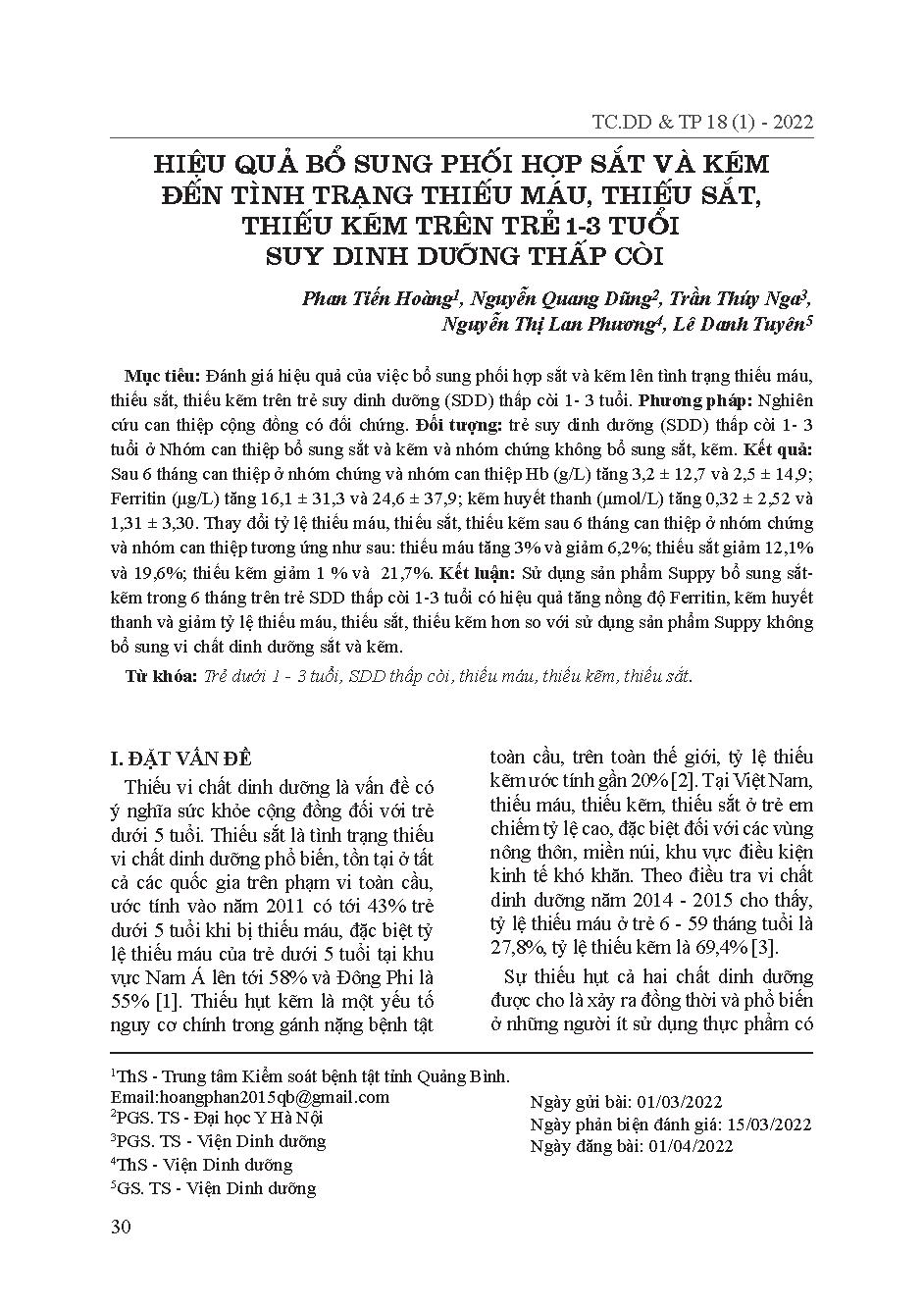 Hiệu quả bổ sung phối hợp sắt và kẽm đến tình trạng thiếu máu, thiếu sắt, thiếu kẽm trên trẻ 1-3 tuổi suy dinh dưỡng thấp còi