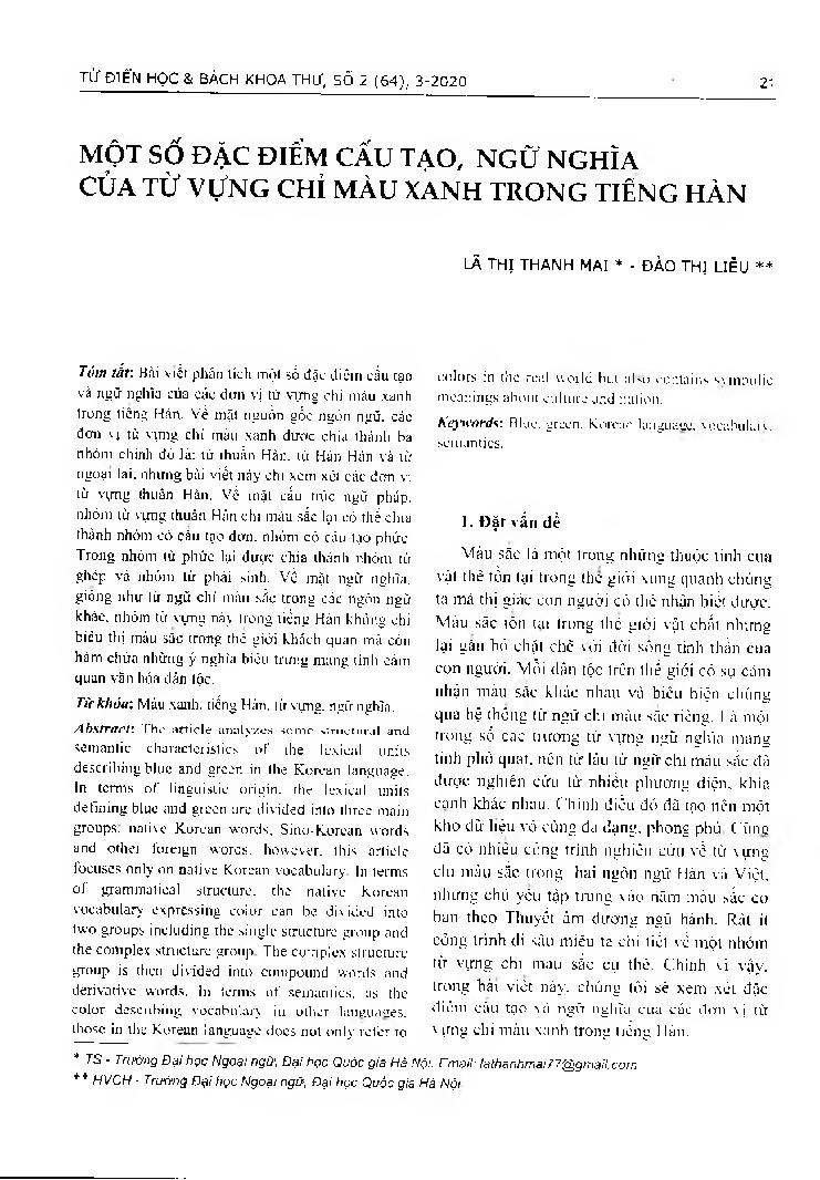 Một số đặc điểm cấu tạo, ngữ nghĩa của từ vựng chi màu xanh trong tiếng Hàn = The main structural, semantic characteristics of u the lexical units describing blue and green colour in the Korean languague