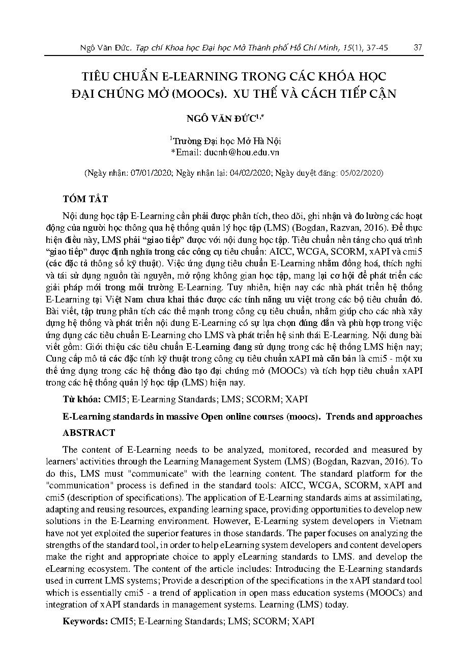 Tiêu chuẩn e-learning trong các khóa học đại chúng mở (MOOCs): Xu thế và cách tiếp cận = E-Learning standards in massive Open online courses (moocs). Trends and approaches
