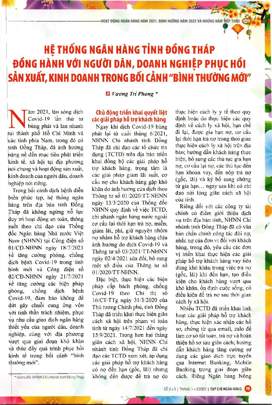 Hệ thống ngân hàng tỉnh Đồng Tháp đồng hành với người dân, doanh nghiệp phục hồi sản xuất, kinh doanh trong bối cảnh “bình thường mới” = Dong Thap province&; 39;s banking system accompanies people and businesses to restore production and business in the co