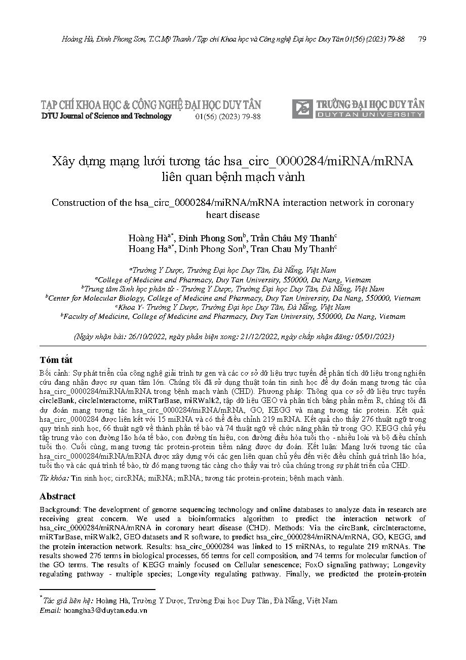 Xây dựng mạng lưới tương tác hsa_circ_0000284/miRNA/mRNA liên quan bệnh mạch vành