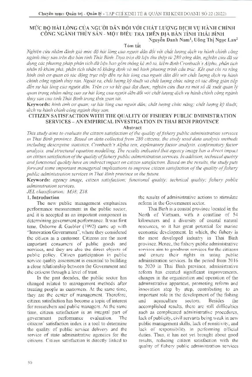 Mức độ hài lòng của người dân đối với chất lượng dịch vụ hành chính công ngành Thủy sản - Một điều tra trên địa bàn tỉnh Thái Bình = Citizen satisfaction with the quality of fishery public administration services - an empirical investigation in Thai Binh
