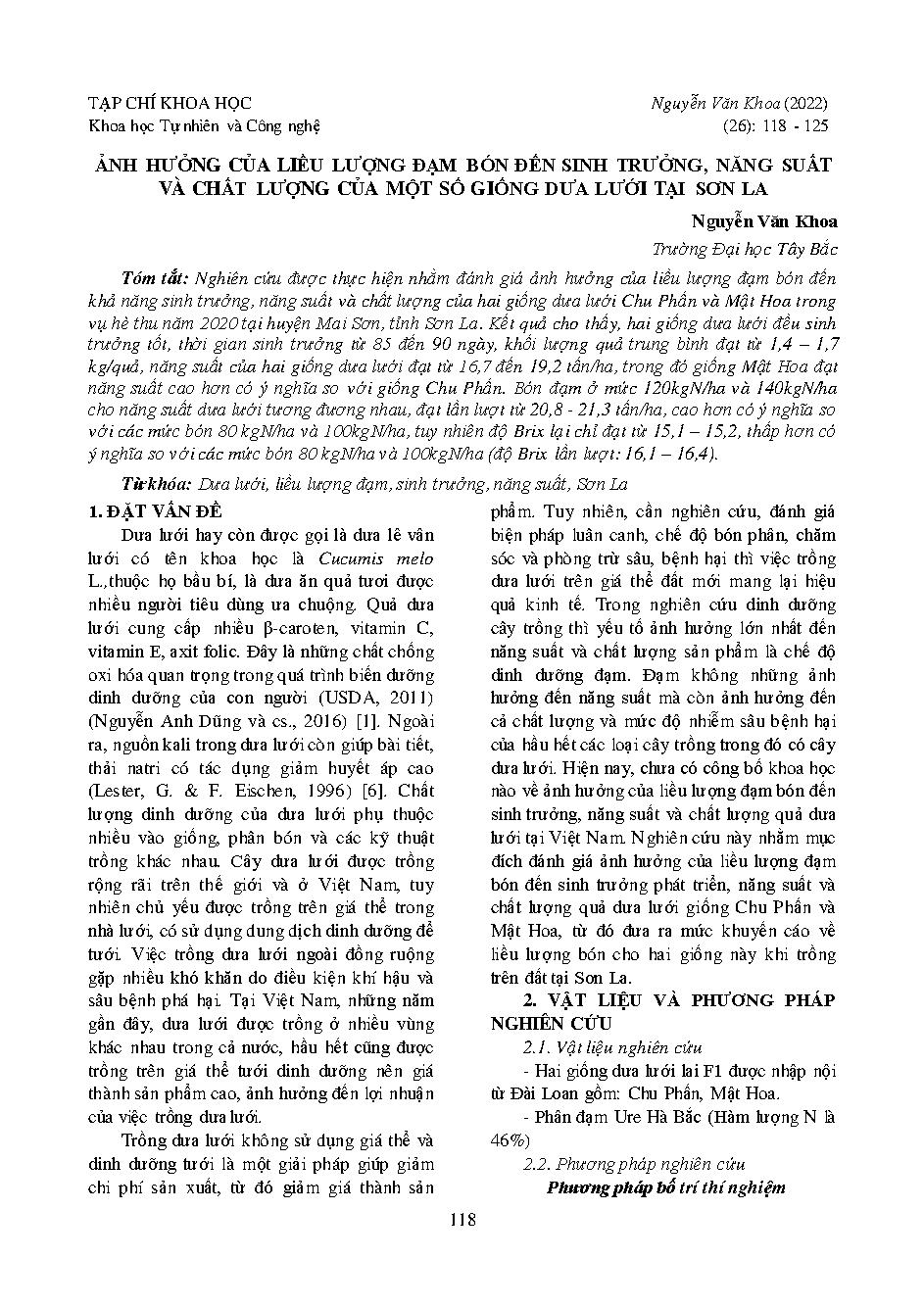 Ảnh hưởng của liều lượng đạm bón đến sinh trưởng, năng suất và chất lượng của một số giống dưa lưới tại Sơn La = Effects of nitrogen on growth, yield and quality of some melon varieties (Cucumis melo L.) grown in Son La province of Vietnam
