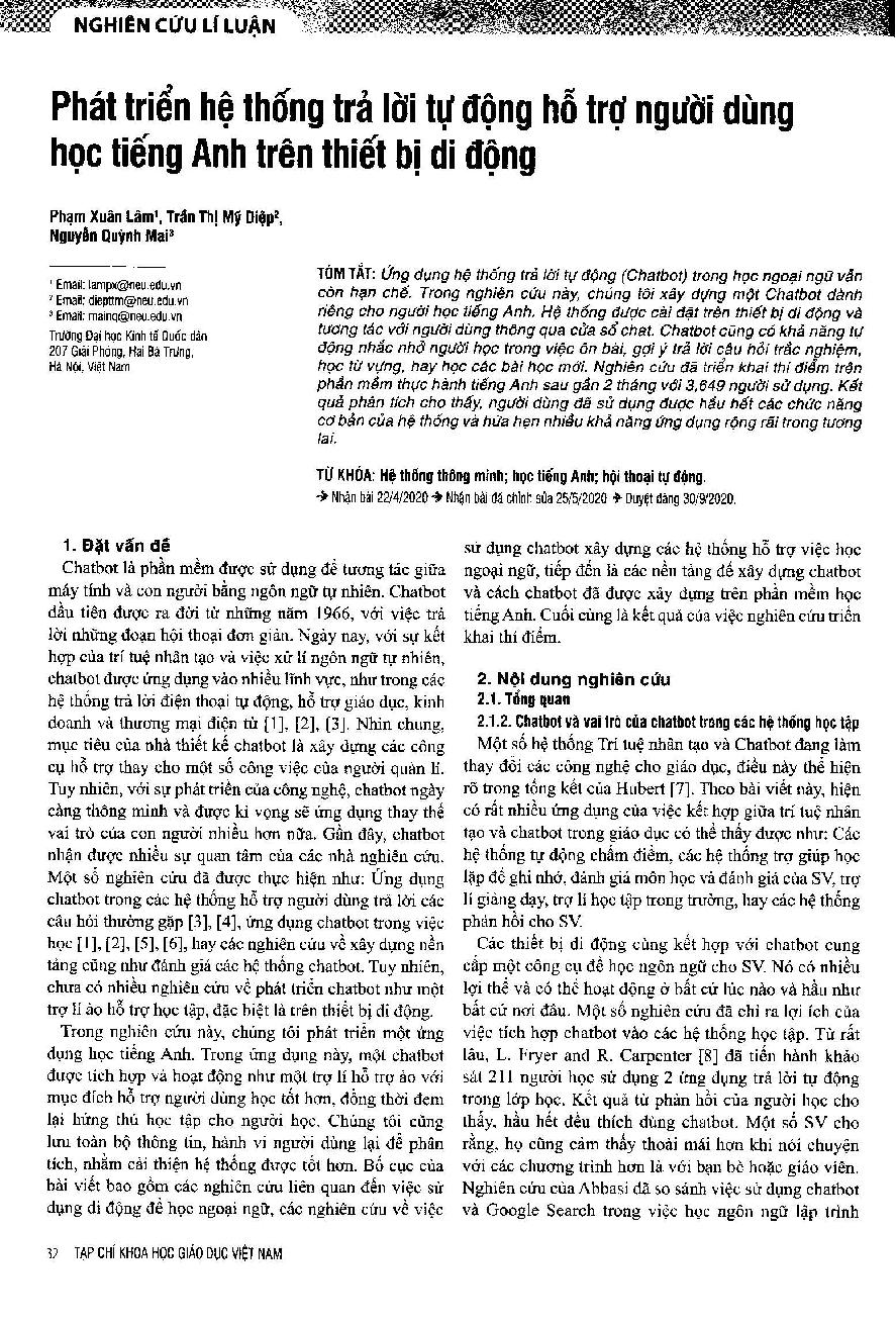 Phát triển hệ thống trả lời tự động hỗ trợ người dùng học tiếng Anh trên thiết bị di động = Developing the automatic conversational system (chatbot) as an intelligent personal assistant for mobile english learning