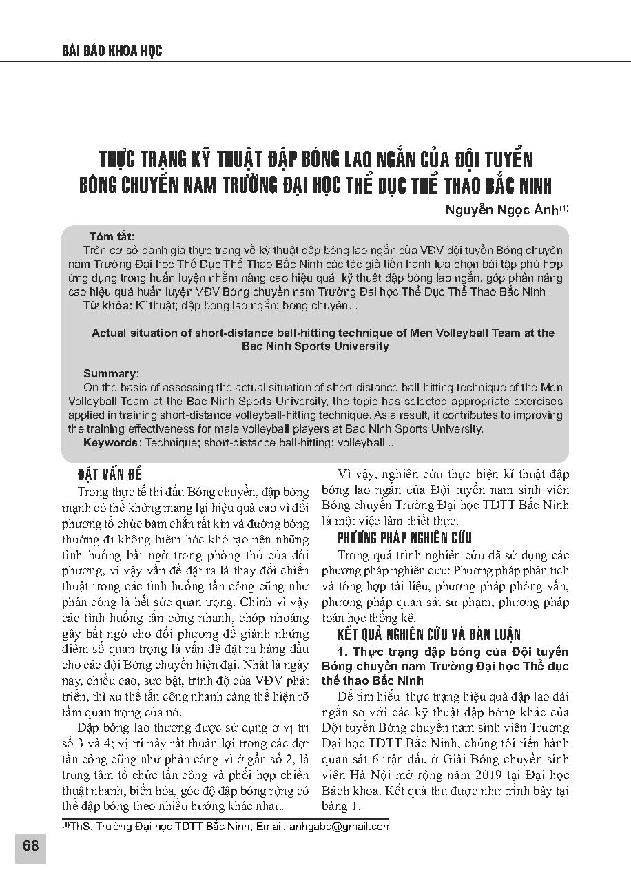 Thực trạng kỹ thuật đập bóng lao ngắn của Đội tuyển Bóng chuyền nam Trường Đại học Thể dục thể thao Bắc Ninh = Actual situation of short-distance ball-hitting technique of Men Volleyball Team at the Bac Ninh Sports University