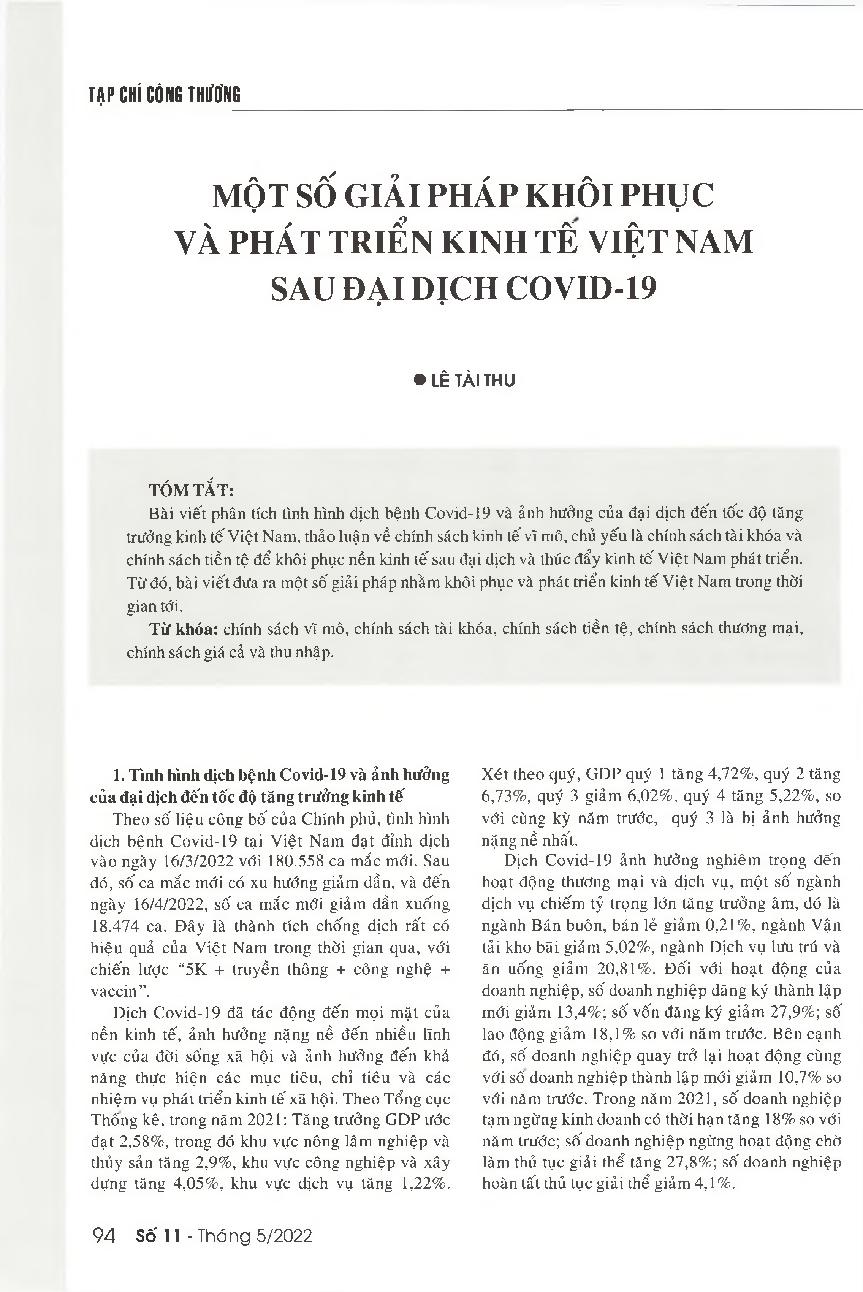 Một số giải pháp khôi phục và phát triển kinh tế Việt Nam sau đại dịch Covid-19 = Some solutions to recover and develop Vietnam&; 39;s economic development in the post-COVID-19 pandemic