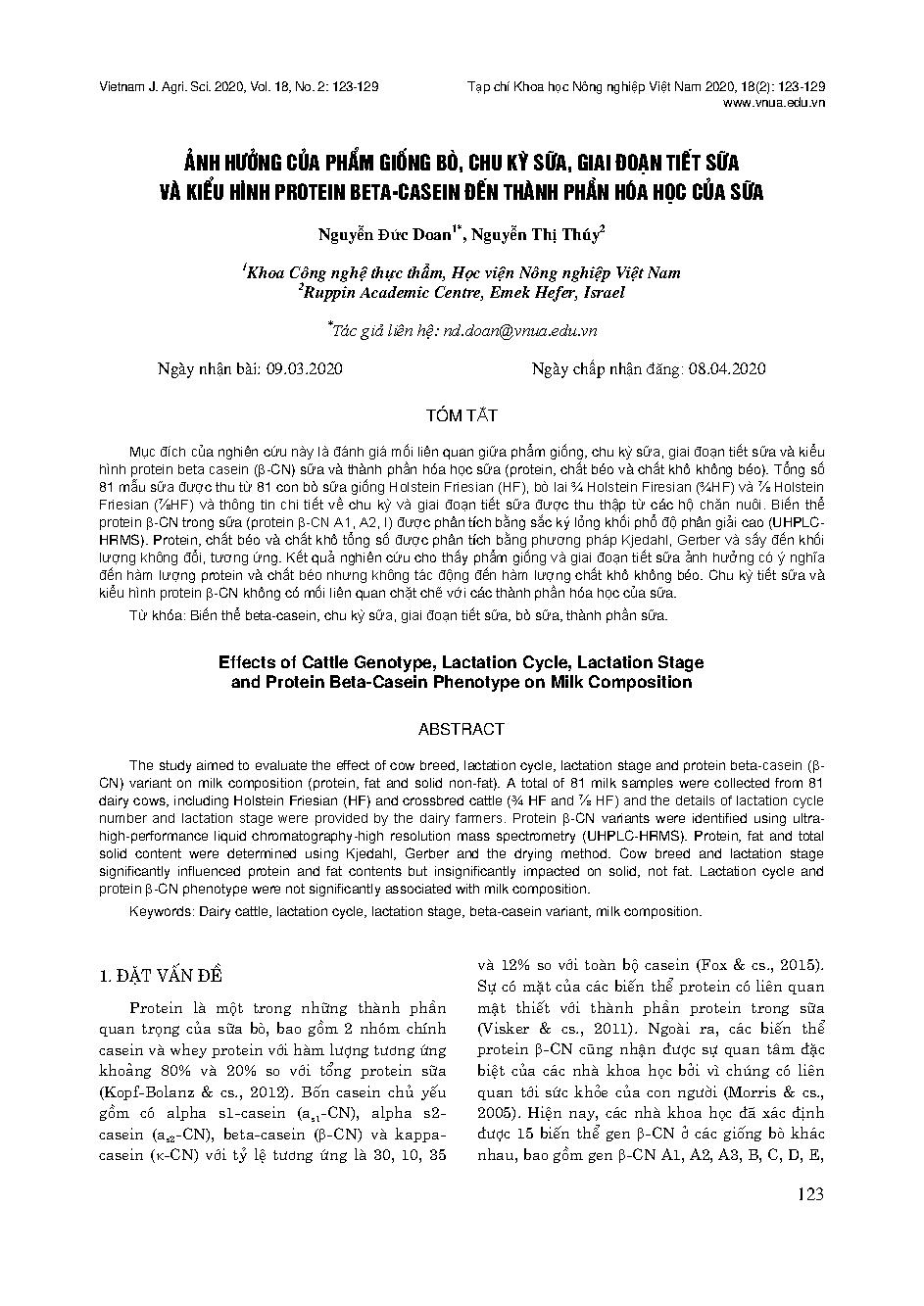 Ảnh hưởng của phẩm giống bò, chu kỳ sữa, giai đoạn tiết sữa và kiểu hình protein beta-casein đến thành phần hóa học của sữa = Effects of Cattle Genotype, Lactation Cycle, Lactation Stage and Protein Beta-Casein Phenotype on Milk Composition