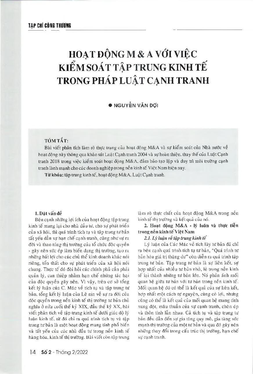 Hoạt động M & A với việc kiểm soát tập trung kinh tế trong pháp luật cạnh tranh = Mergers and acquisitions and the State management of economic concentration in the Law on Competition