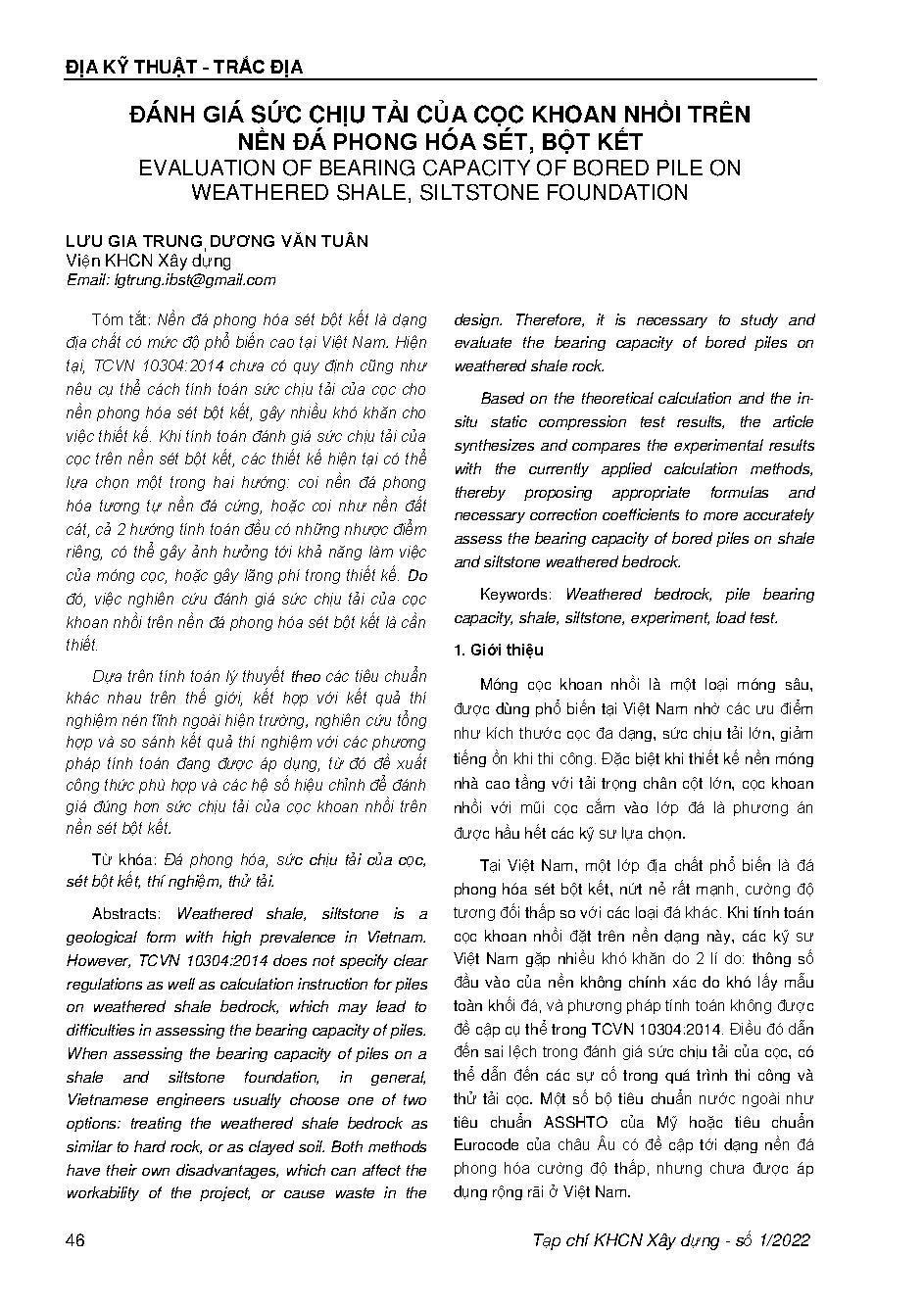 Đánh giá sức chịu tải của cọc khoan nhồi trên nền đá phong hóa sét, bột kết = Evaluation of bearing capacity of bored pile on weathered shale, siltstone foundation