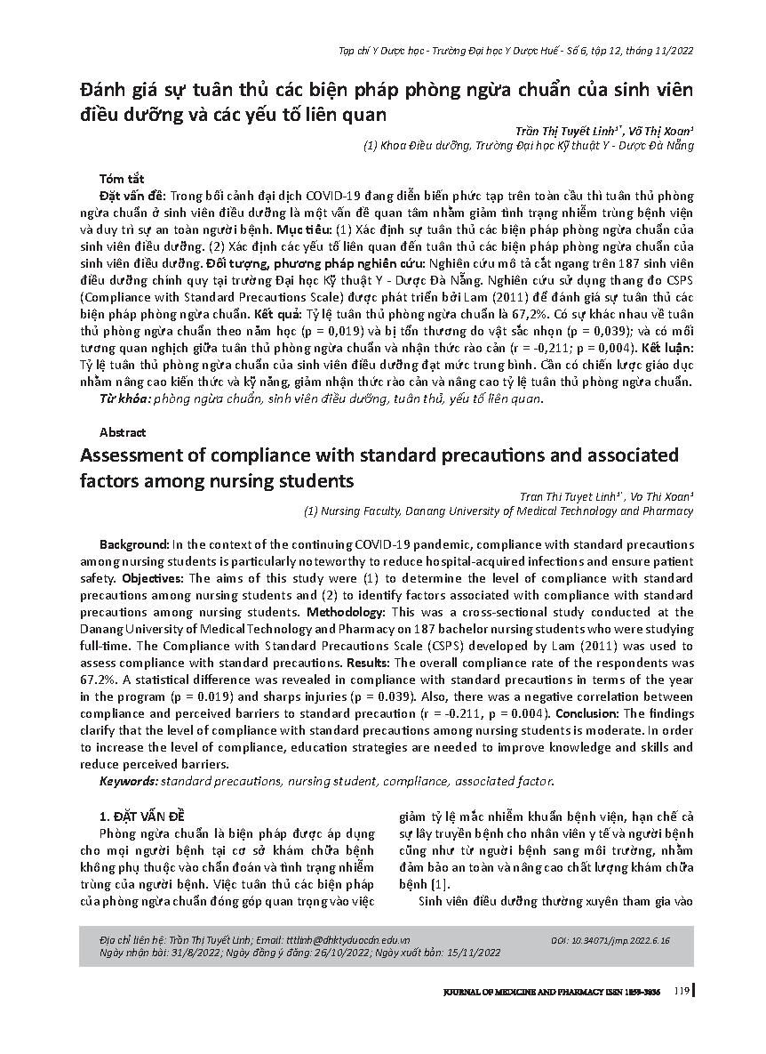 Đánh giá sự tuân thủ các biện pháp phòng ngừa chuẩn của sinh viên điều dưỡng và các yếu tố liên quan = Assessment of compliance with standard precautions and associated factors among nursing students