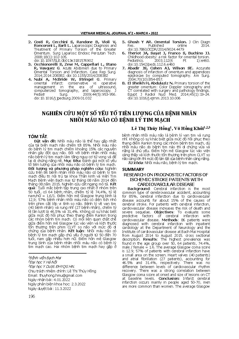 Nghiên cứu một số yếu tố tiên lượng của bệnh nhân nhồi máu não có bệnh lý tim mạch = Research on prognostic factors of ischemic stroke patients with cardiovascular disease