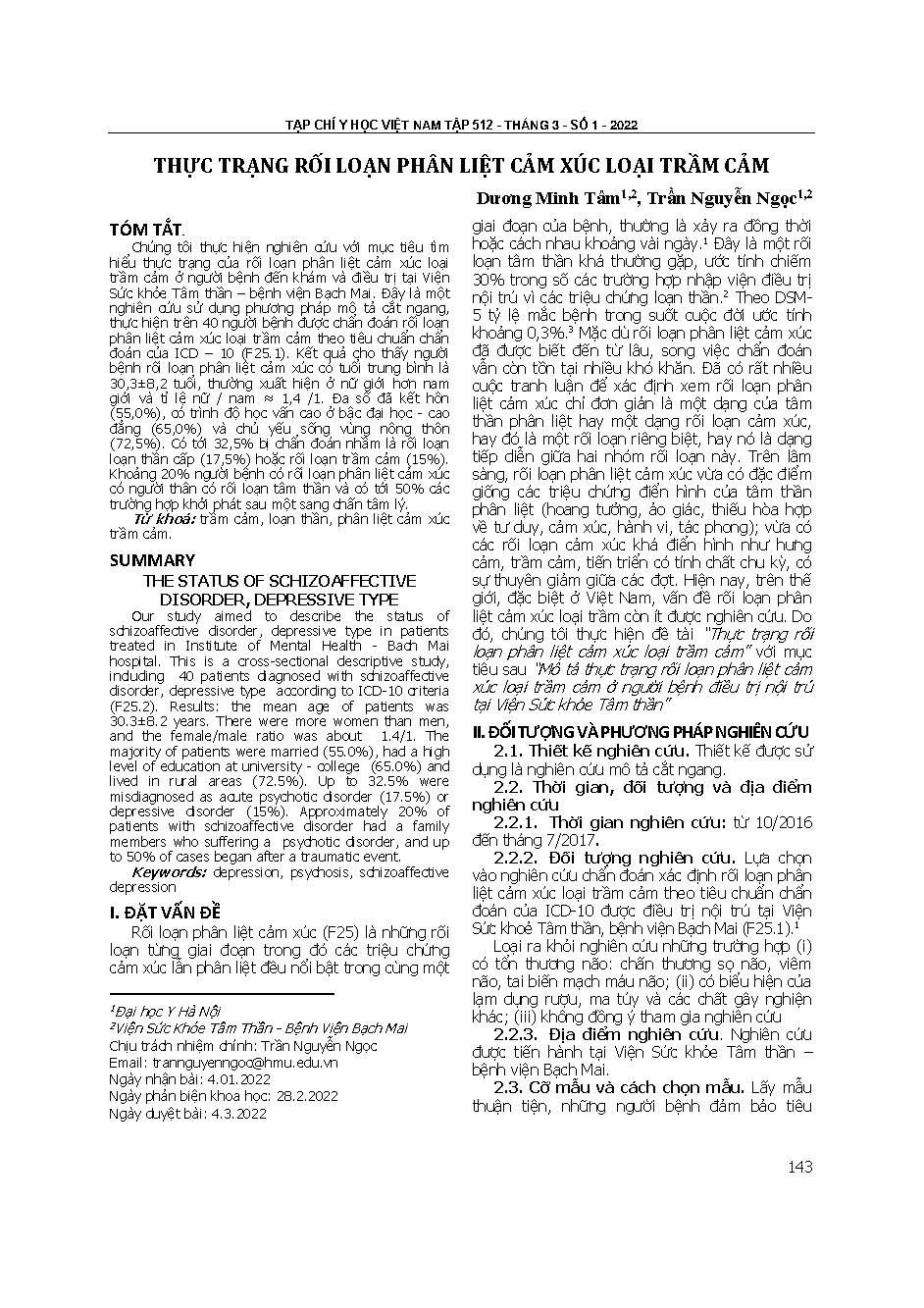 Thực trạng rối loạn phân liệt cảm xúc loại trầm cảm = The status of schizoaffective disorder, depressive type