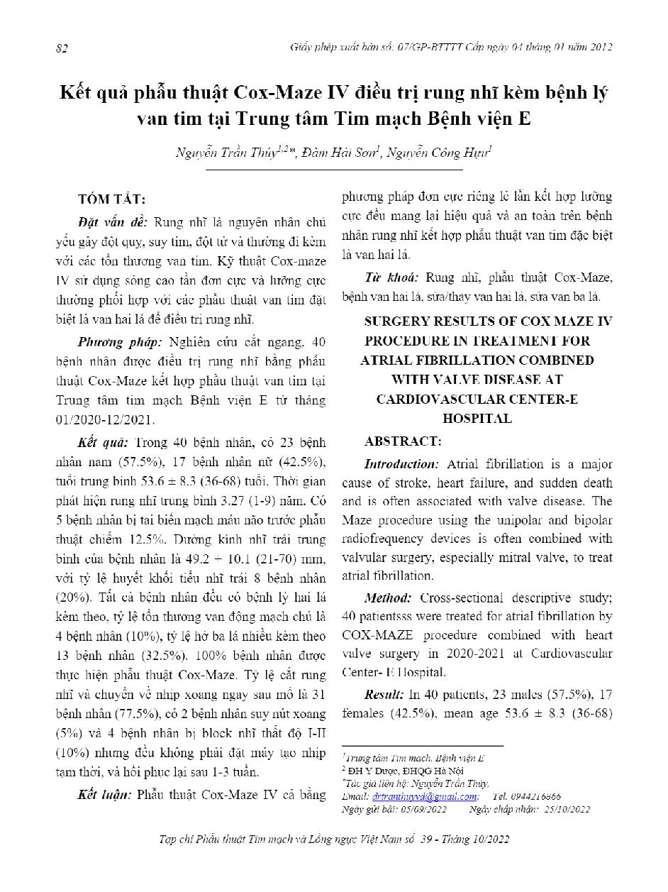 Kết quả phẫu thuật Cox-Maze IV điều trị rung nhĩ kèm bệnh lý van tim tại Trung tâm Tim mạch, Bệnh viện E = Surgery results of cox maze iv procedure in treatment for atrial fibrillation combined with valve disease at cardiovascular center-E hospital