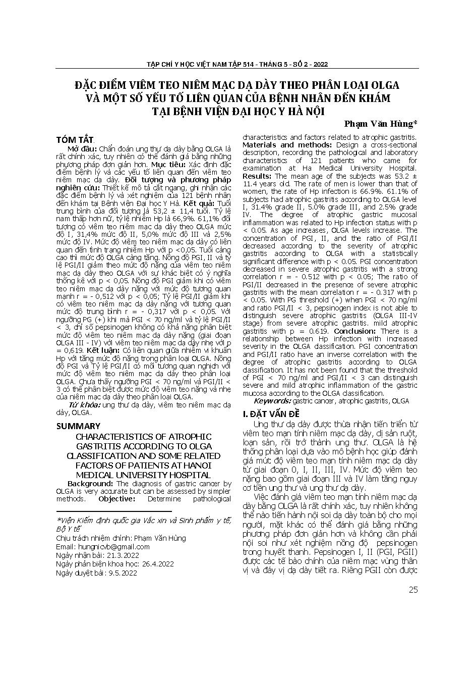 Đặc điểm viêm teo niêm mạc dạ dày theo phân loại OLGA và một số yếu tố liên quan của bệnh nhân đến khám tại Bệnh viện Đại học Y Hà Nội = Characteristics of atrophic gastritis according to olga classification and some related factors of patients at Hanoi m