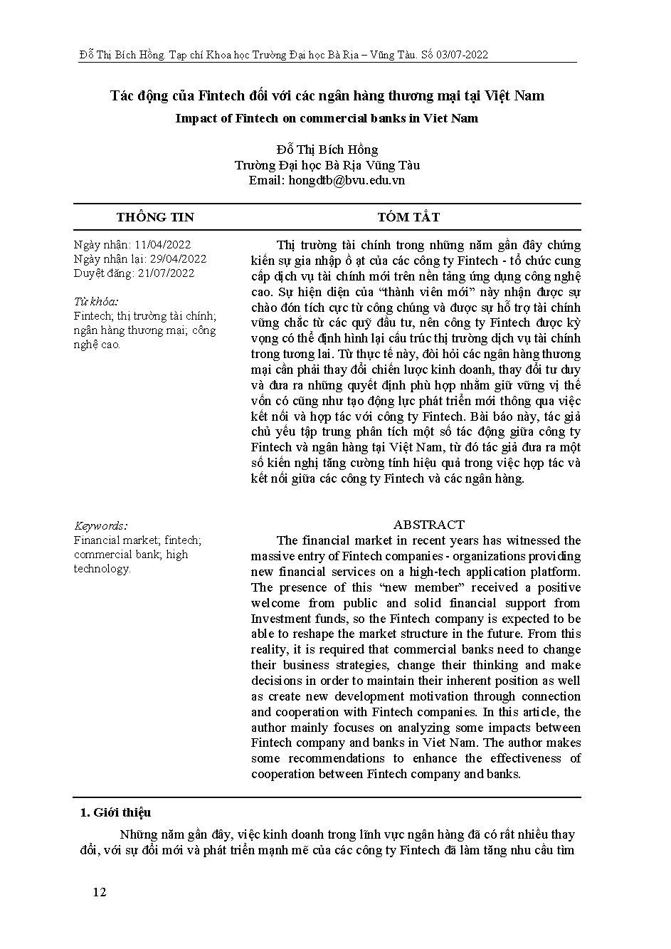 Tác động của Fintech đối với các ngân hàng thương mại tại Việt Nam = Impact of Fintech on commercial banks in Viet Nam
