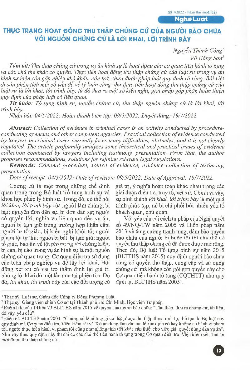 Thực trạng hoạt động thu thập chứng cứ của người bào chữa với nguồn chứng cứ là lời khai, lời trình bày = Situation of collecting evidence of defender with evidence source of testimony, presentation