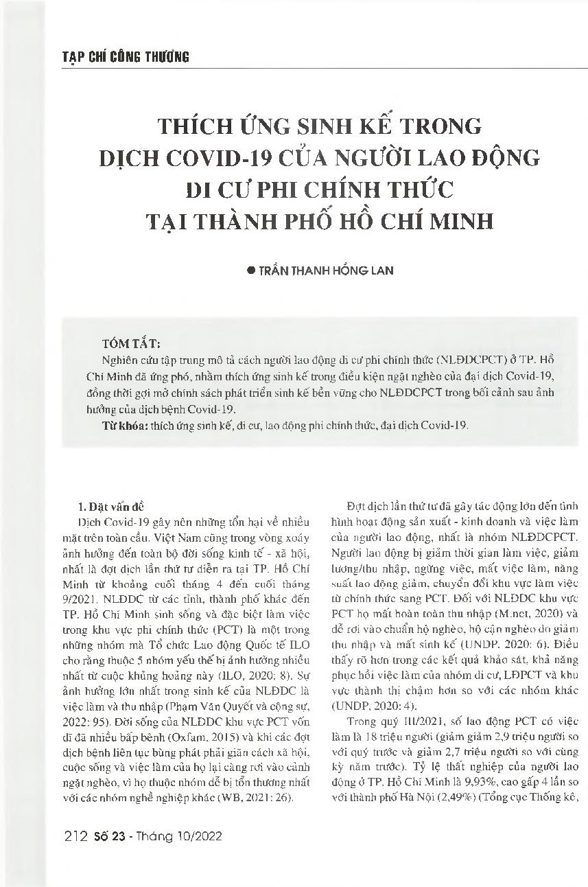Thích ứng sinh kế trong dịch Covid-19 của người lao động di cư phi chính thức tại thành phố Hồ Chí Minh = Livelihood adaptation of Migrant labor in informal sectors in Ho Chi Minh City during the COVID-19 pandemic