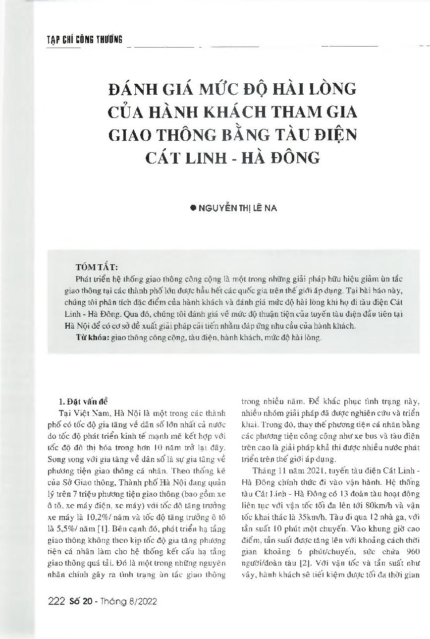 Đánh giá mức độ hài lòng của hành khách tham gia giao thông bằng tàu điện Cát Linh - Hà Đông = Evaluating the satisfaction of passengers with the Cat Linh - Ha Dong metro transport service