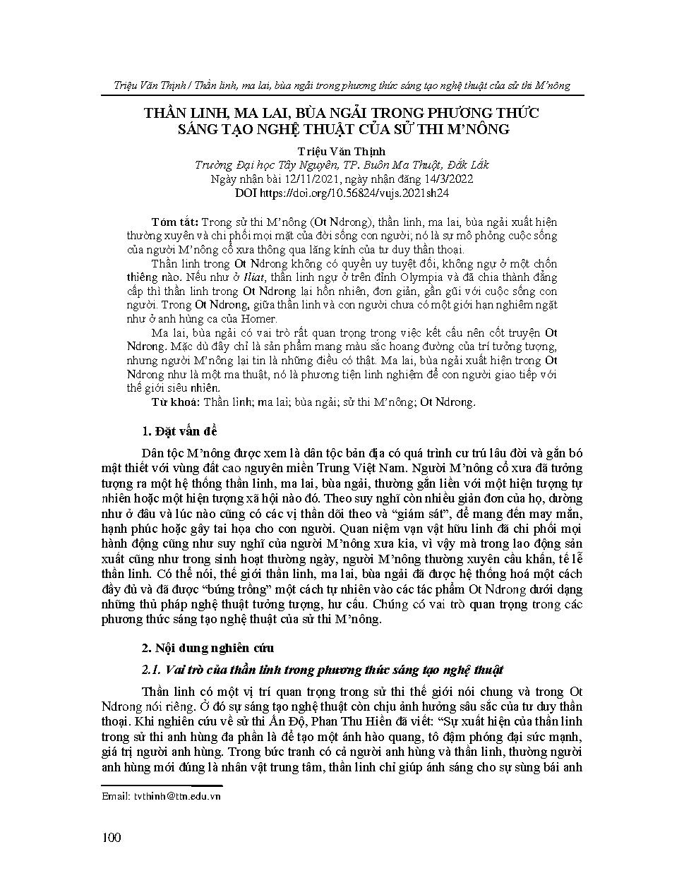 Thần linh, ma lai, bùa ngải trong phương thức sáng tạo nghệ thuật của sử thi M’nông = The spirits, charms, ghosts in the art creative method of M’nong epics