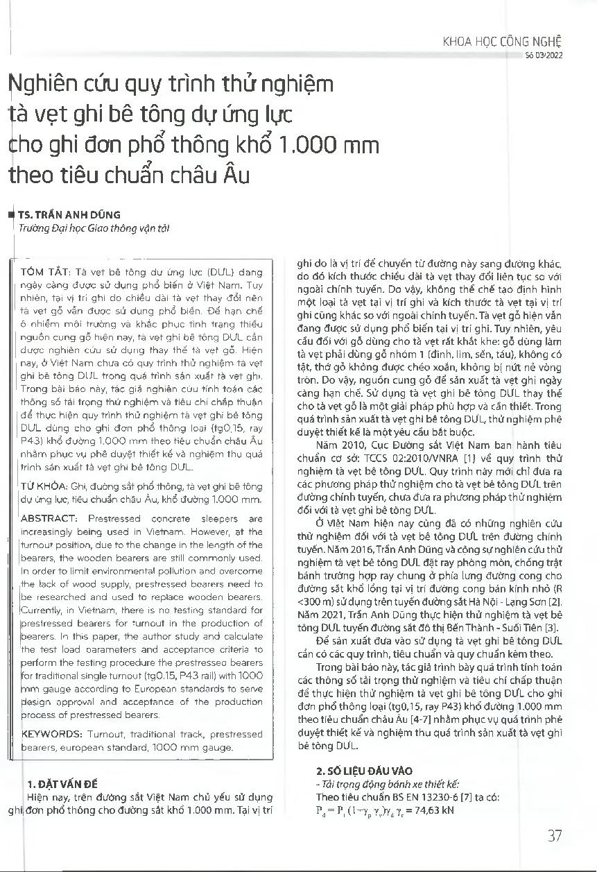 Nghiên cứu quy trình thử nghiệm tà vẹt ghi bê tông dự ứng lực cho ghi đơn phổ thông khổ 1.000 mm theo tiêu chuẩn châu Âu = Research on the testing Standard for prestressed concrete sleepers of the traditional single turnout (1000 mm gauge) according to Eu