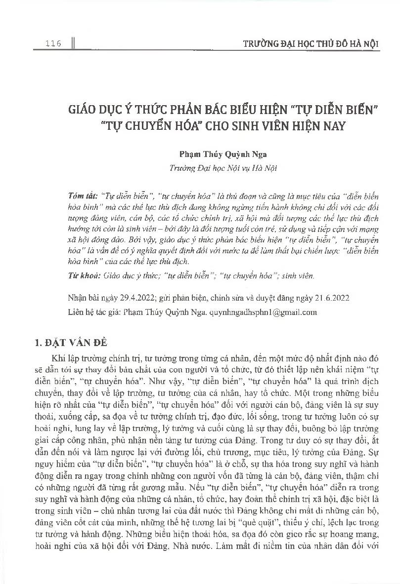 Giáo dục ý thức phản bác biểu hiện "tự diễn biến” "tự chuyển hóa” cho sinh viên hiện nay = Conscious education to combat the "self-evolution" and "self-transformation" for students