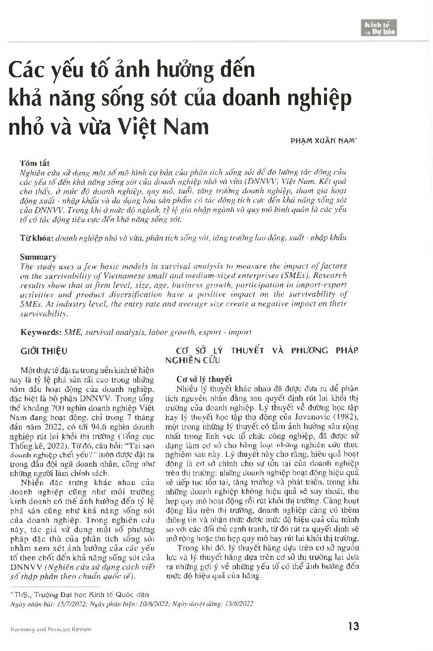 Các yếu tố ảnh hưởng đến khả năng sống sót của doanh nghiệp nhỏ và vừa Việt Nam = Factors impacting the survivability of Vietnamese small and medium-sized enterprises