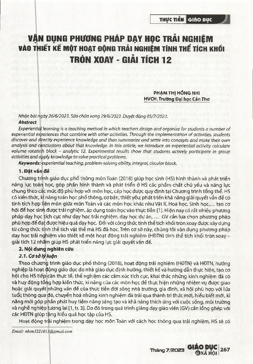 Vận dụng phương pháp dạy học trải nghiệm vào thiết kê' một hoạt động trải nghiệm tính thể tích khỗi tròn xoay - Giải tích 12 = Applying experiential teaching methods to design an experiential activity to calculate the volumeofa rotating block-Analysis 12.