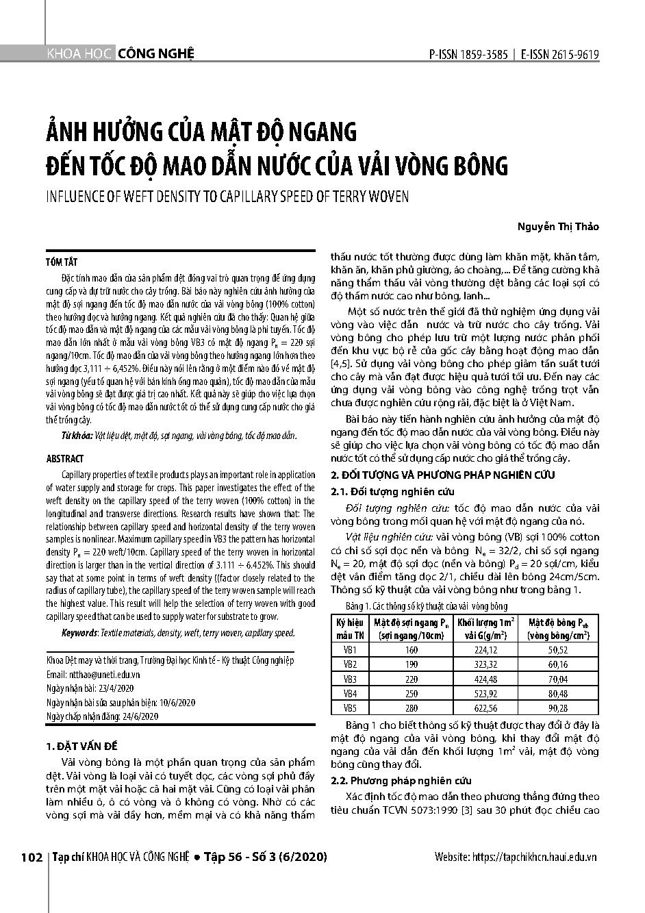 INFLUENCE OF WEFT DENSITY TO CAPILLARY SPEED OF TERRY WOVEN = ẢNH HƯỞNG CỦA MẬT ĐỘ NGANG ĐẾN TỐC ĐỘ MAO DẪN NƯỚC CỦA VẢI VÒNG BÔNG