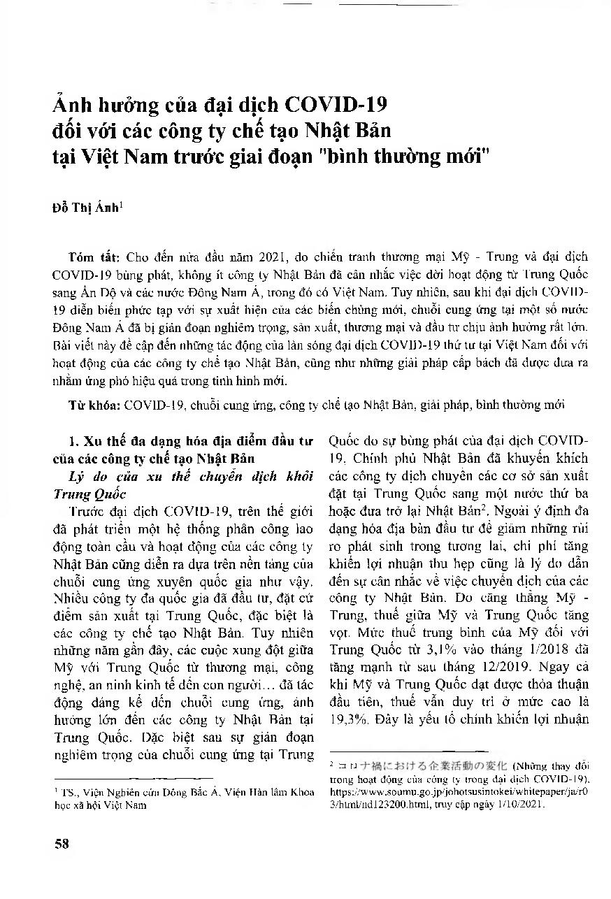 Ảnh hưởng của đại dịch COVID-19 đối với các công ty chế tạo Nhật Bản tại Việt Nam trước giai đoạn ’’bình thường mới” = The Influences of COVID-19 on Japanese Manufacturing Companies in Vietnam before the "New Normal" Stage