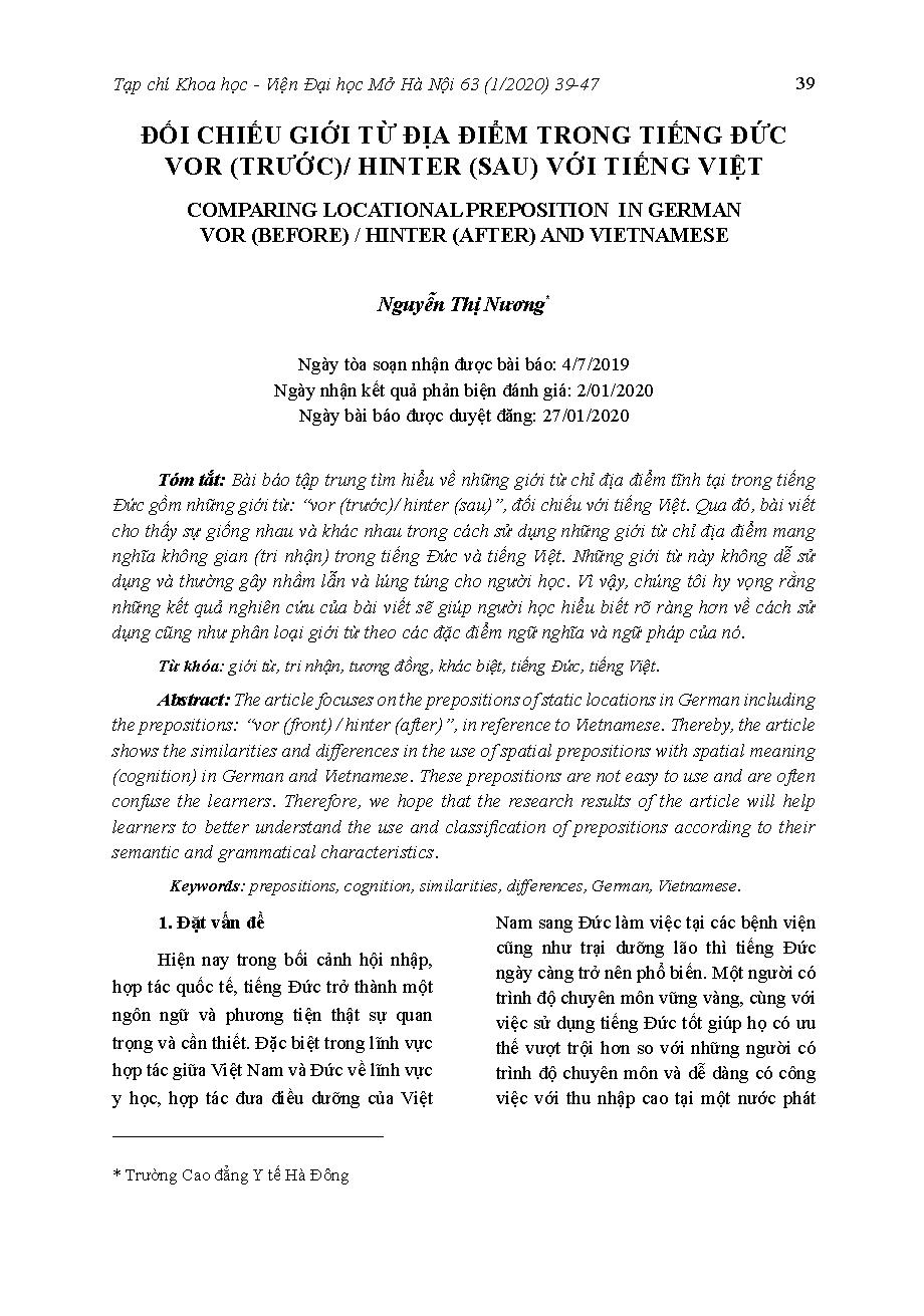 Đối chiếu giới từ địa điểm trong tiếng Đức vor (trước)/ hinter (sau) với tiếng Việt = Comparing locational preposition in German vor (before) / hinter (after) and Vietnamese