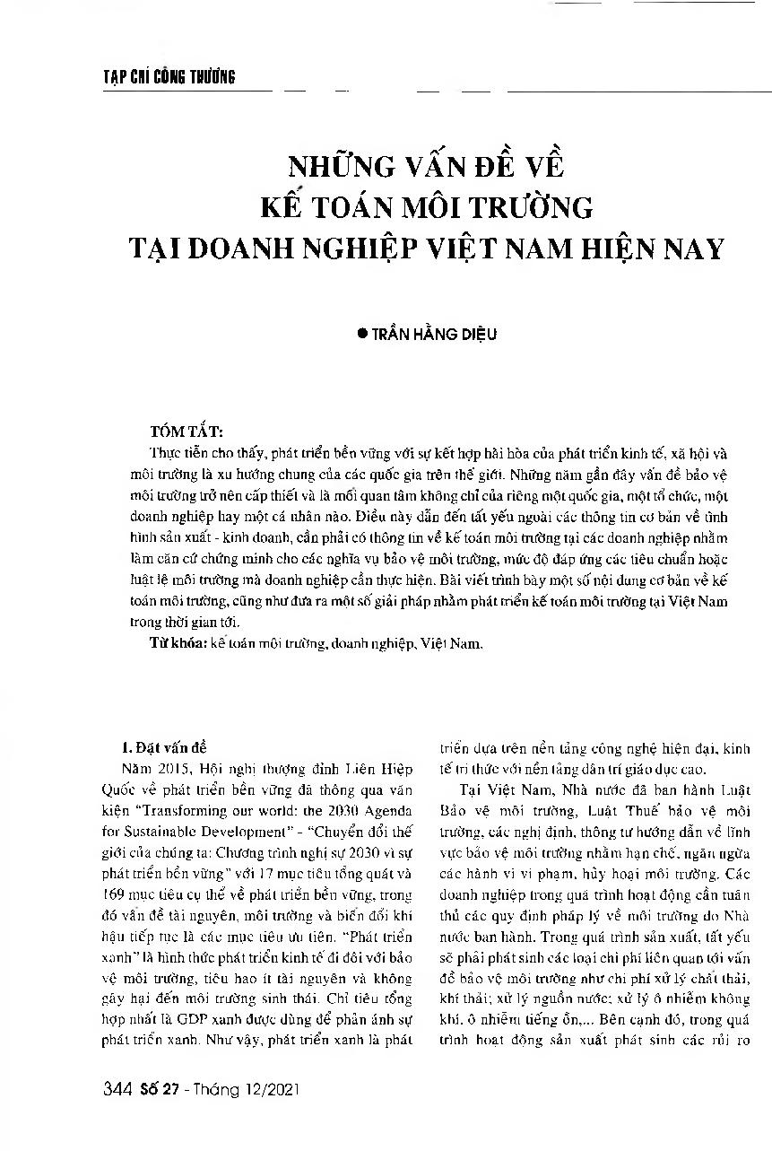 Những vấn đề về kế toán môi trường tại doanh nghiệp Việt Nam hiện nay = Some environmental accounting issues at Vietnamese enterprise