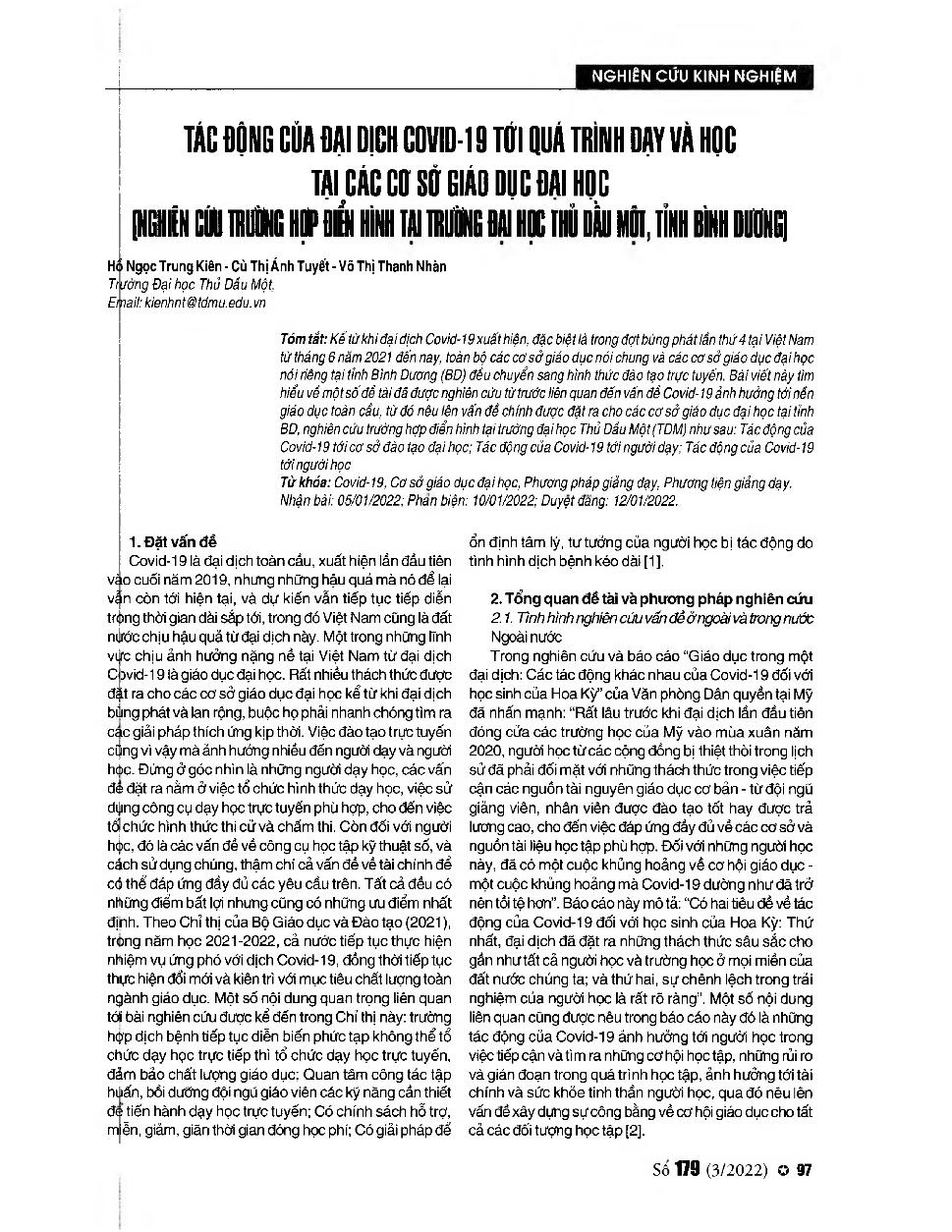 Tác động của đại dịch Covid-19 tới quá trình dạy và học tại các cơ sở giáo dục đại học (Nghiên cứu trường hợp điển hình tại Đại học Thủ Dầu Một, tỉnh Bình Dương) = Impact of the covid-19 pandemic on the teaching process at higher education institutions (A