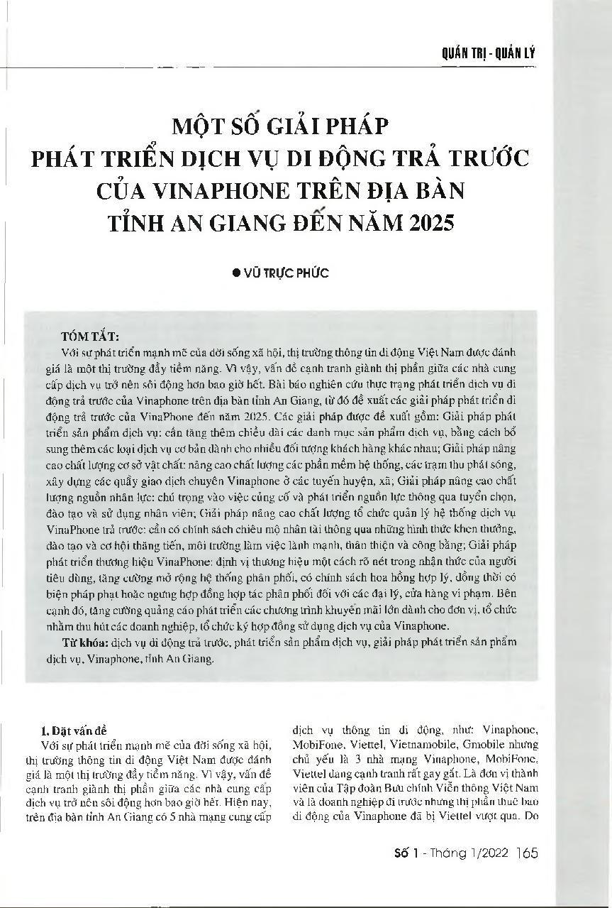 Một số giải pháp phát triển dịch vụ di động trả trước của Vinaphone trên địa bàn tỉnh An Giang đến năm 2025 = Some solutions to help Vinaphone develop its prepaid mobile services in An Giang Province for the period 2022 - 2025