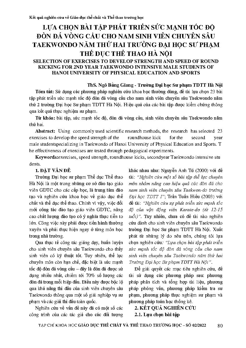 Lựa chọn bài tập phát triển sức mạnh tốc độ đòn đá vòng cầu cho nam sinh viên chuyên sâu taekwondo năm thứ hai trường Đại học Sư phạm Thể dục thể thao Hà Nội = Selection of exercises to develop strength and speed of round kicking for 2nd year taekwondo in