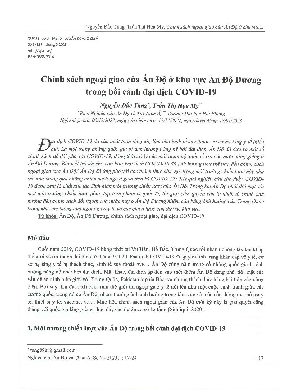 Chính sách ngoại giao của Ấn Độ ở khu vực Ấn Độ Dương trong bối cảnh đại dịch COVID-19 = India's diplomacy in the Indian Ocean Region in the context of the COVID-19 pandemic