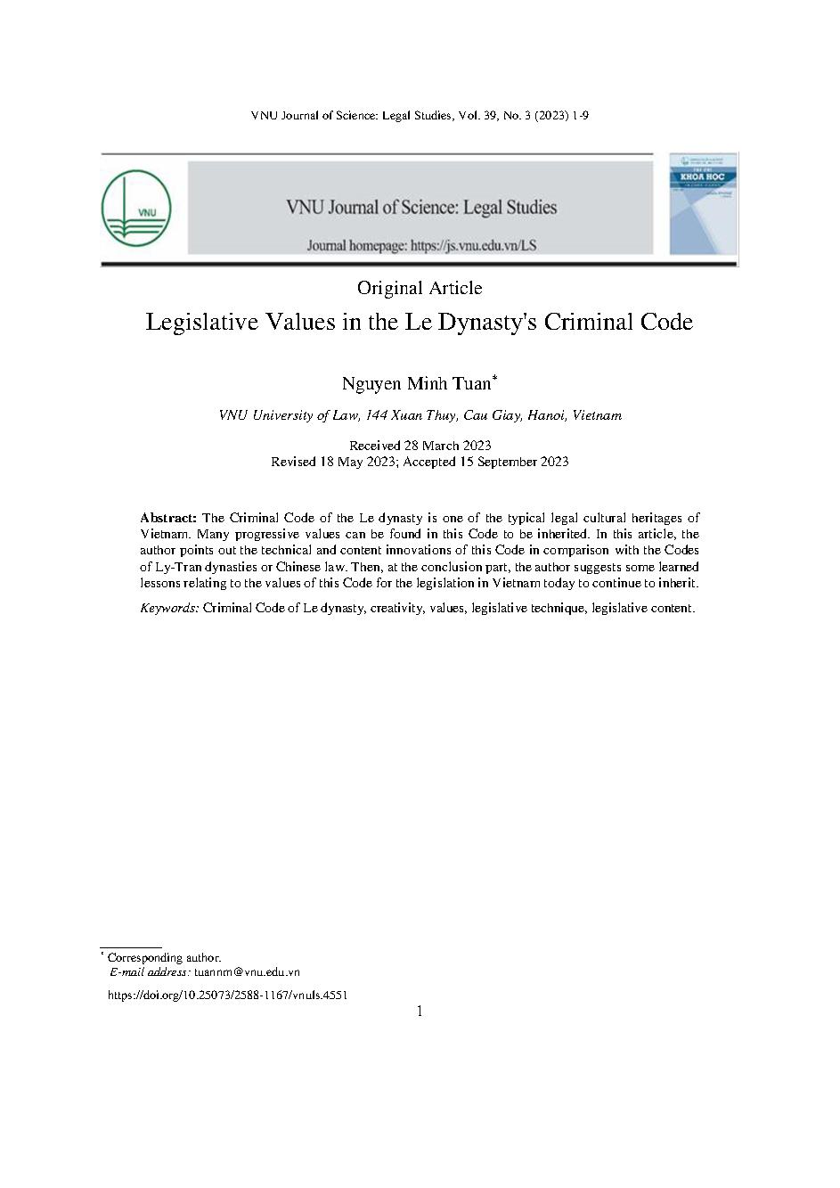 Những giá trị về lập pháp của Quốc triều Hình luật thời Lê = Legislative values in the Le Dynasty's Criminal Code